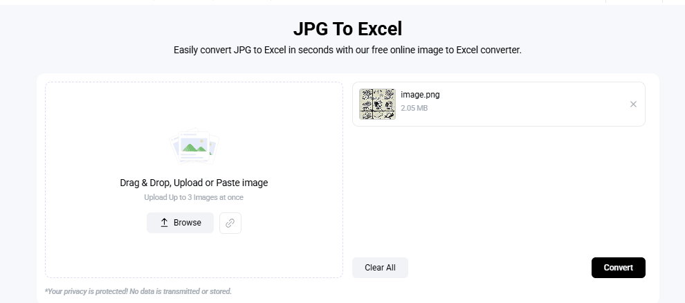Access the image to Excel converter and upload the image of product listings into the tool.